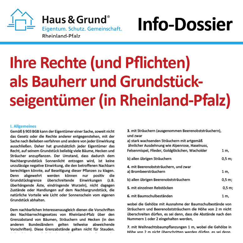 Es behandelt die Themen: - Grenzabstände für Pflanzen (in Rheinland-Pfalz): Wer Bäume, Sträucher oder Hecken pflanzt, muss einen vorgeschriebenen