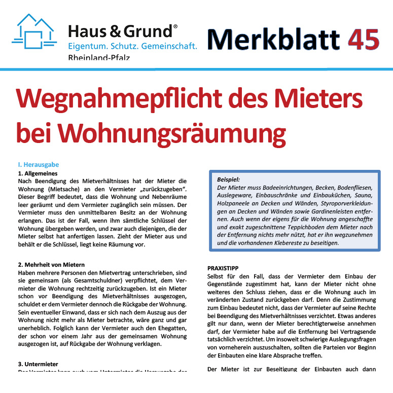 Merkblatt: Wegnahmepflicht des Mieters bei Wohnungsräumung